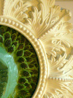 With the main piece done, I get started on the background and frame. I like to use small wood frames and remove the glass and back part. Then I make a new back out of polymer clay. This makes it easier to attach my sculpture to the frame. Flowers and leaves are sculpted inside the frame right onto the background.